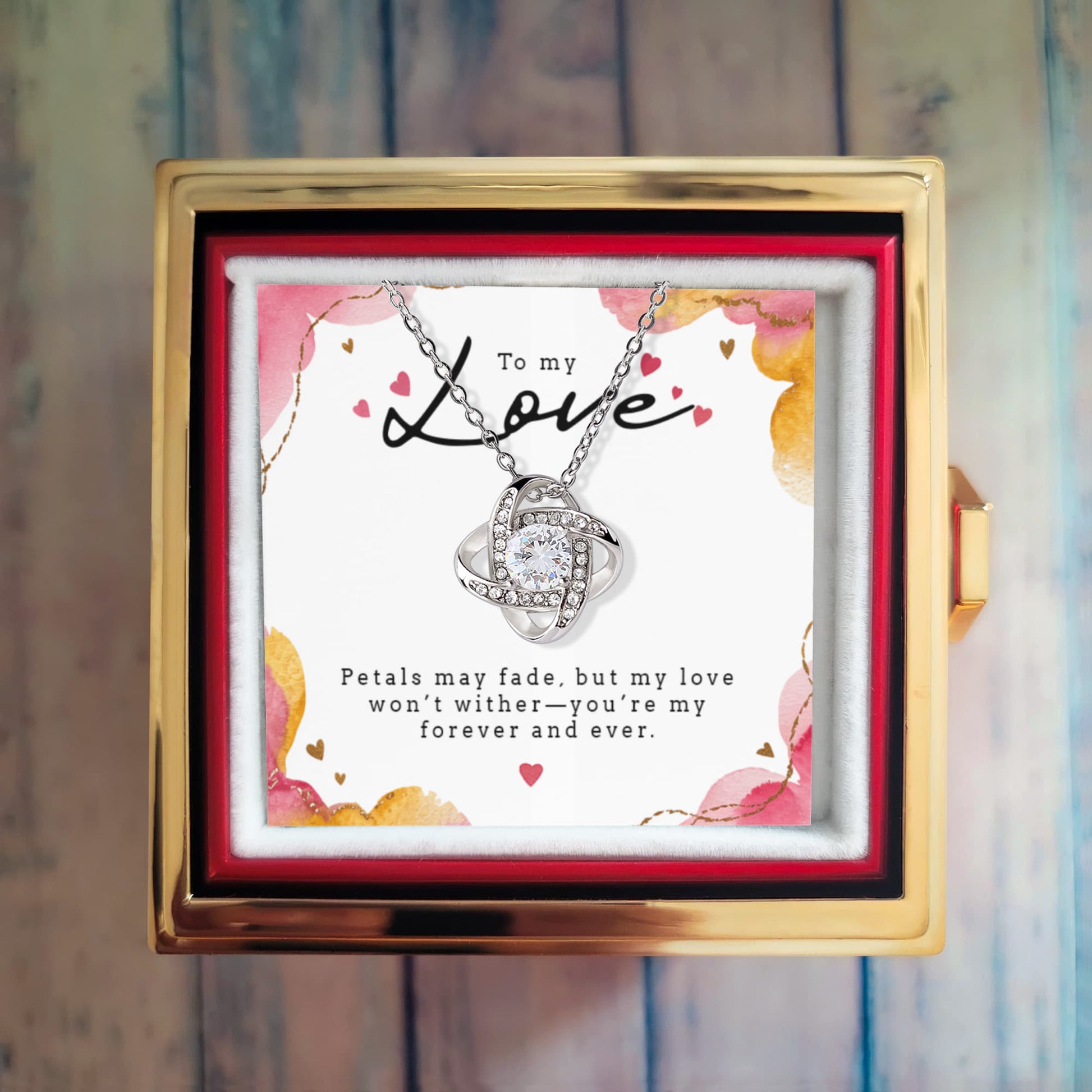 Imagine her reaction as she receives this beautiful Love Knot Necklace. Representing an unbreakable bond between two souls, this stunning pendant is adorned with premium cubic zirconia crystals, making it a timeless symbol of love and devotion. The luxurious box, featuring a meticulously preserved rose that never fades, adds an extra touch of love. With a simple turn of the gold knob, her breathtaking gift is revealed—making it the perfect sentimental gift for that special someone.